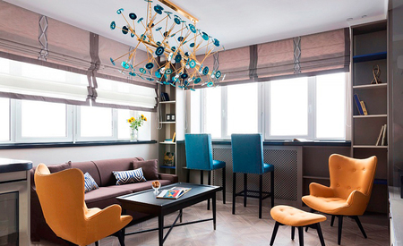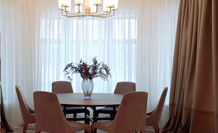 Акцент освещения на столовой зоне, открытие штор, включение музыки или телевизора