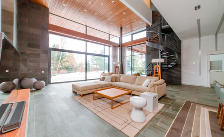Система включает разделы: освещение, климат, мультимедиа, безопасность. Заказчик часто бывает в отъезде, поэтому в доме реализована функция охраны периметра, видеонаблюдение с архивом и возможностью дистанционного просмотра, а также видеодомофония с передачей входящих звонков на мобильные устройства
